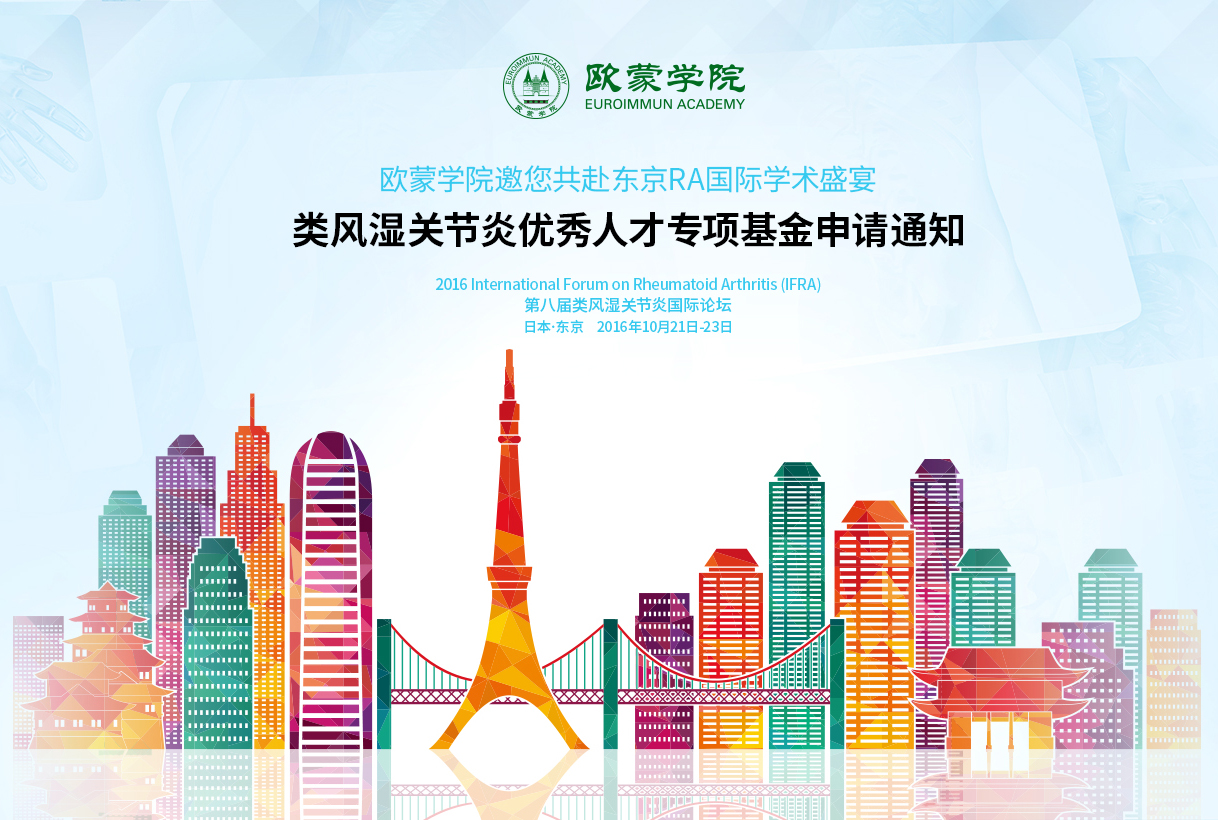 第八屆“類風濕關節(jié)炎國際論壇(IFRA)”將于2016年10月21~23日在日本東京召開,該論壇為風濕領域的國際性學術盛會。歐蒙學院秉承“分享前沿知識,推動醫(yī)學教育”的宗旨,以提高疾病的行業(yè)診斷水平為愿景,為推動類風濕關節(jié)炎(RA)疾病的醫(yī)療學術發(fā)展,特設立“歐蒙學院——類風濕關節(jié)炎優(yōu)秀人才”專項基金,由歐蒙學院資助RA領域的優(yōu)秀人才赴東京參會。