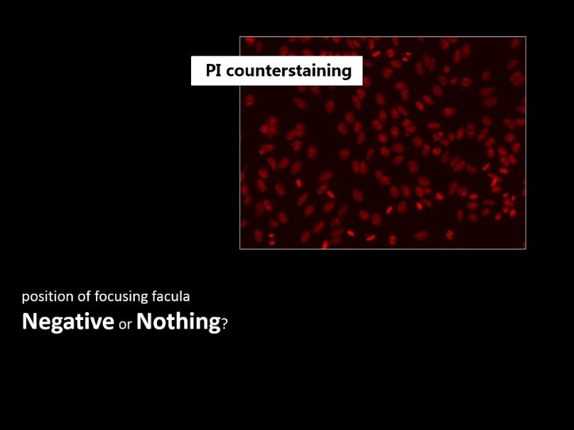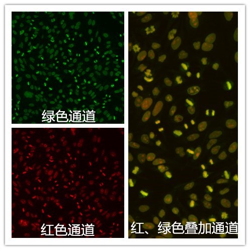 EUROPattern拍出的圖片,共有三種。綠色通道,即與熒光顯微鏡拍出的圖片相同。紅色通道,細(xì)胞核經(jīng)過(guò)碘化丙啶紅色復(fù)染,通過(guò)紅色通道獲取信息,不僅可以幫助尋找和識(shí)別細(xì)胞核和分裂期細(xì)胞,還可以避免可能出現(xiàn)的假陰性結(jié)果。紅綠疊加通道,可以清晰的觀察區(qū)分細(xì)胞核與細(xì)胞胞漿信息。