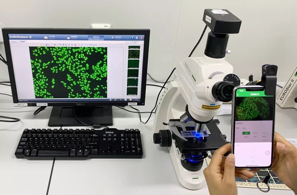 歐蒙間接免疫熒光檢測平臺作為神經(jīng)系統(tǒng)自身免疫性疾病重要的檢測技術(shù)平臺被納入該教學(xué)培訓(xùn)體系,助力相關(guān)腦病的診斷以及專業(yè)人才建設(shè)。歐蒙間接免疫熒光檢測平臺是歐蒙五大方法學(xué)平臺之一,本次培訓(xùn)活動主要應(yīng)用到間接免疫熒光顯微鏡(EUROStar Ⅲ Plus)和成像系統(tǒng)(EUROPattern II)、以及遠程熒光輔助判讀服務(wù)(小未讀片):