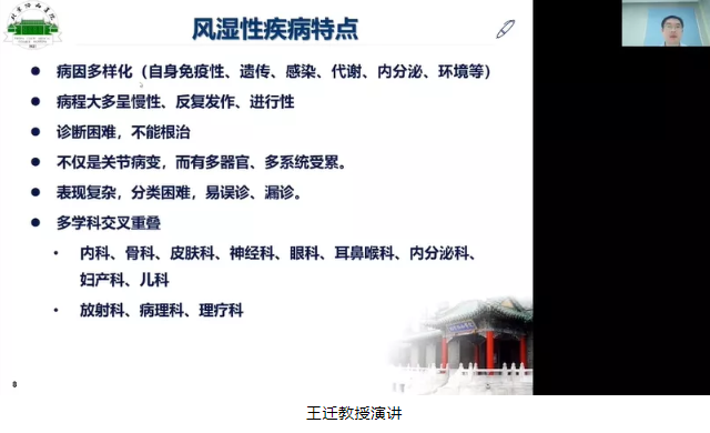 北京協(xié)和醫(yī)院風(fēng)濕免疫科王遷教授從臨床癥狀著眼,給我們帶來(lái)《風(fēng)濕病-隱藏在各科的炸彈》。風(fēng)濕病臨床表現(xiàn)多樣,涉及皮膚、口腔、眼、耳、鼻、呼吸系統(tǒng)、心血管系統(tǒng)、神經(jīng)系統(tǒng)、血液系統(tǒng)、內(nèi)分泌系統(tǒng)、消化系統(tǒng)等,表現(xiàn)復(fù)雜,分類困難,易誤診、漏診。及時(shí)的進(jìn)行自身抗體譜檢測(cè),有助于發(fā)現(xiàn)早期和不典型患者,避免誤診、漏診。