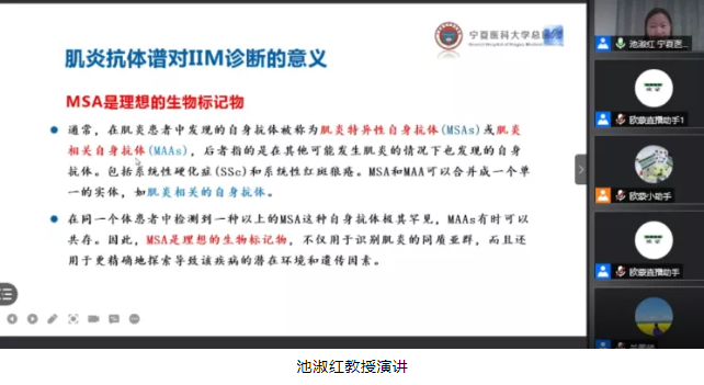 寧夏醫(yī)科大學(xué)總醫(yī)院風(fēng)濕免疫科池淑紅教授的講題為《肌炎抗體譜的應(yīng)用及病例分享》。池教授通過(guò)剖析特發(fā)性炎癥肌病診斷標(biāo)準(zhǔn)的演變及肌炎抗體譜發(fā)展,結(jié)合本院肌炎抗體譜的應(yīng)用,總結(jié):肌炎抗體譜對(duì)炎性肌病的分型、診斷很重要。著重推薦不明原因的間質(zhì)性肺病進(jìn)行肌炎抗體譜篩查。