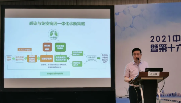 一直以來,間質(zhì)性肺疾?。↖LD)的診治都是呼吸科醫(yī)師常常需要面對的棘手難題。程主任首先以幾個生動病例為切入點,向與會聽眾介紹了間質(zhì)性肺疾病的一般分類、臨床特點、診斷路徑和影像學(xué)表現(xiàn),并分享了自己在診治間質(zhì)性肺疾病的個人經(jīng)驗,如獨特皮疹的指向性和超薄CT的診斷價值。隨后,程主任從免疫學(xué)檢測和病原學(xué)檢測兩個角度,詳細介紹了間質(zhì)性肺疾病的一體化臨床診斷。