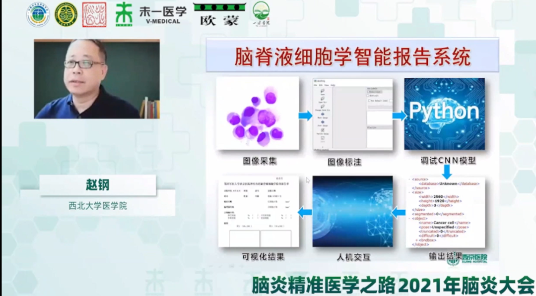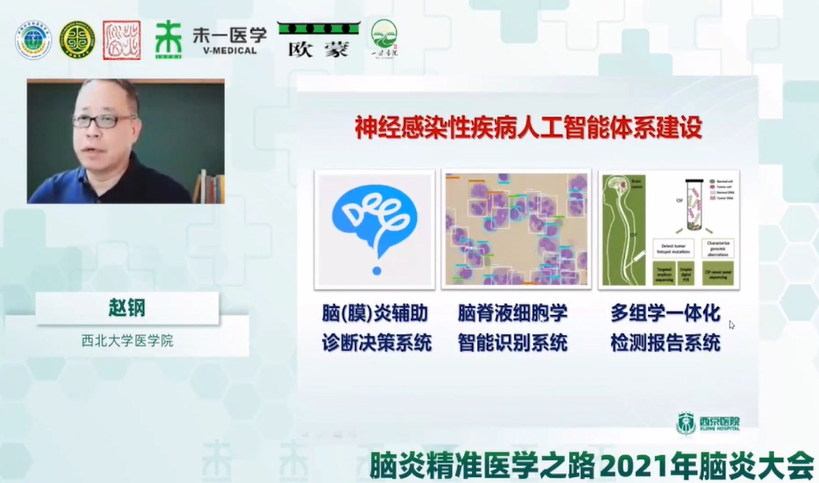 首先趙鋼教授做題為《神經(jīng)感染性疾病人工智能體系搭建》學(xué)術(shù)報(bào)告。報(bào)告中,趙鋼教授生動(dòng)形象地介紹了人工智能在醫(yī)學(xué)領(lǐng)域的發(fā)展歷程,國(guó)內(nèi)已從經(jīng)驗(yàn)醫(yī)學(xué)發(fā)展到了智能醫(yī)學(xué)。趙鋼教授介紹其科研團(tuán)隊(duì)借助人工智能搭建了腦膜炎人工智能輔助診斷決策系統(tǒng)、腦脊液細(xì)胞學(xué)智能報(bào)告系統(tǒng)及腦脊液mNGS精準(zhǔn)醫(yī)學(xué)智能診斷系統(tǒng),為臨床診斷、腦脊液細(xì)胞學(xué)診斷、病原學(xué)診斷及藥物敏感性診斷方面提供了快速、準(zhǔn)確的新型武器,為感染性疾病的診斷和未來的治療方面提供了新的手段,是精準(zhǔn)醫(yī)療的未來發(fā)展趨勢(shì)。