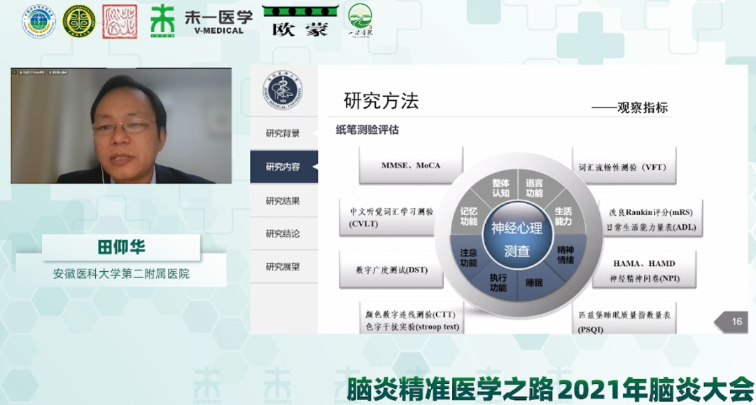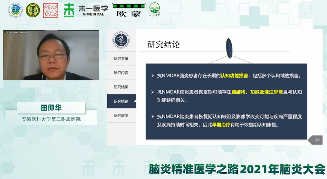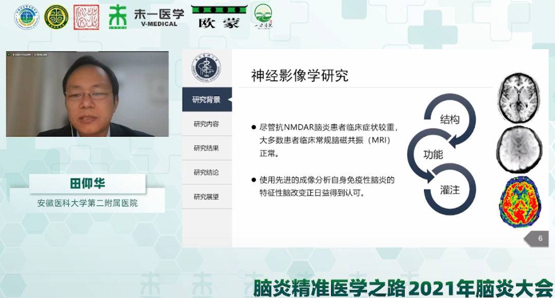 安徽醫(yī)科大學(xué)第二附屬醫(yī)院田仰華教授做了題為《抗N-甲基-D-天冬氨酸受體腦炎患者的認(rèn)知功能及腦影像研究》的學(xué)術(shù)報(bào)告。在臨床上,對(duì)抗NMDAR腦炎患者的治療已經(jīng)具有豐富的經(jīng)驗(yàn),患者的生存率和癲癇發(fā)作得到了良好的控制,但仍有約75%患者存在長(zhǎng)期的認(rèn)知功能損壞,嚴(yán)重影響患者生活質(zhì)量。田教授研究團(tuán)隊(duì)從神經(jīng)心理學(xué)評(píng)估和功能影像兩個(gè)維度對(duì)抗NMDAR腦炎患者恢復(fù)期的認(rèn)知缺陷進(jìn)行驗(yàn)證,發(fā)現(xiàn)抗NMDAR腦炎患者恢復(fù)期認(rèn)知缺陷及影像學(xué)改變可能與疾病嚴(yán)重程度及疾病持續(xù)時(shí)間相關(guān),早期治療有助于恢復(fù)期的認(rèn)知康復(fù)。
