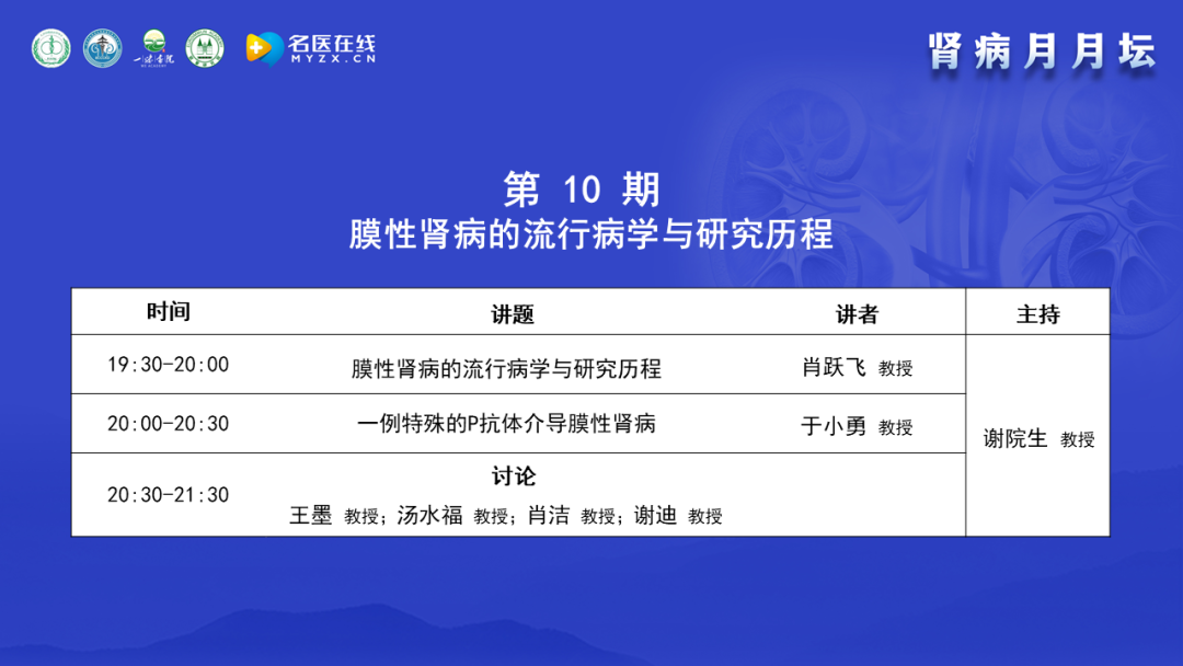 眾所周知,腎臟病患病率很高,特別是膜性腎病,在很多單位的腎活檢比例中占據(jù)首位。膜性腎病的無(wú)創(chuàng)診斷和治療手段日新月異,而且膜性腎病的異質(zhì)性很大,很多膜性腎病的病理表現(xiàn)大同小異,但是致病原因卻不一致,診療手段應(yīng)對(duì)應(yīng)病因?;诖吮尘埃澳I病月月壇”自2022年5月17日開(kāi)始舉辦,在每個(gè)月的第三周的周二晚上,每月一期,每期一個(gè)主題,已經(jīng)舉辦了9期,包括”激素和免疫抑制劑在膜性腎病的合理應(yīng)用”、“利妥昔單抗在膜性腎病的合理應(yīng)用”、“原發(fā)性和繼發(fā)性膜性腎病的鑒別”、“中醫(yī)對(duì)膜性腎病的認(rèn)識(shí)”、“膜性腎病的抗原分類及發(fā)病機(jī)制”、“膜性腎病的臨床表現(xiàn)、無(wú)創(chuàng)診斷和病理診斷”、“膜性腎病的自發(fā)緩解和非免疫抑制治療”、“非典型膜性腎病的病理表現(xiàn)及鑒別診斷思路”、“膜性腎病與腫瘤”。本期是“腎病月月壇”的第10期,主題是“膜性腎病的流行病學(xué)與研究歷程”,通過(guò)對(duì)膜性腎病不同的專題進(jìn)行深入探討,希望大家對(duì)膜性腎病有更深的認(rèn)識(shí)。膜性腎病近幾年在診斷方面有跨時(shí)代進(jìn)步,特別是非創(chuàng)傷性的檢測(cè)磷脂酶A2受體,對(duì)疾病的診斷、預(yù)后判斷、治療選擇上都非常有幫助。還有膜性腎病各種新的治療手段,包括單克隆抗體在膜性腎病中的應(yīng)用進(jìn)展也日新月異。針對(duì)這些問(wèn)題,本期特舉辦膜性腎病的流行病學(xué)與研究歷程的專題學(xué)術(shù)活動(dòng),邀請(qǐng)的講者和點(diǎn)評(píng)、討論嘉賓都是業(yè)內(nèi)非常著名的臨床專家、研究生導(dǎo)師、腎內(nèi)科主任,具有豐富的臨床、教學(xué)和科研經(jīng)驗(yàn),相信他們的分享一定會(huì)對(duì)大家的臨床診療有所幫助。