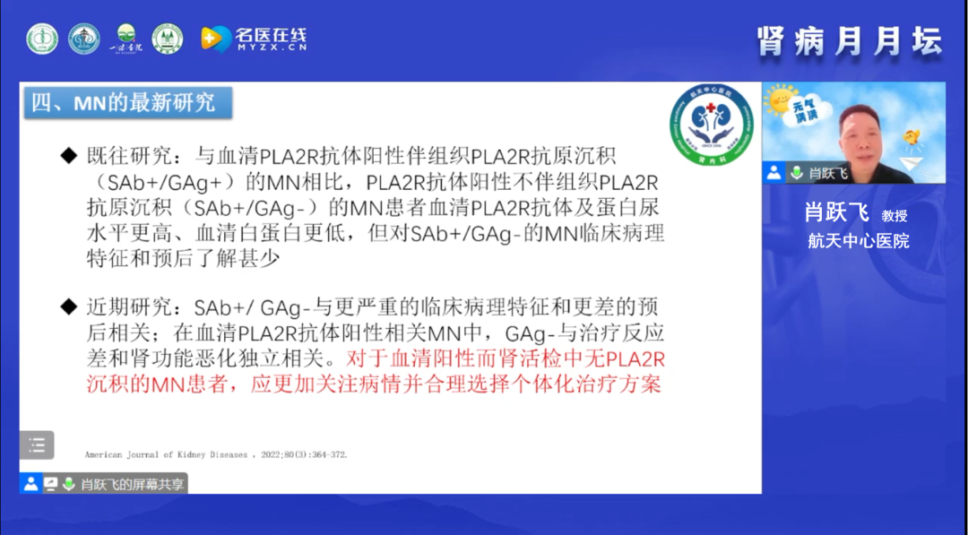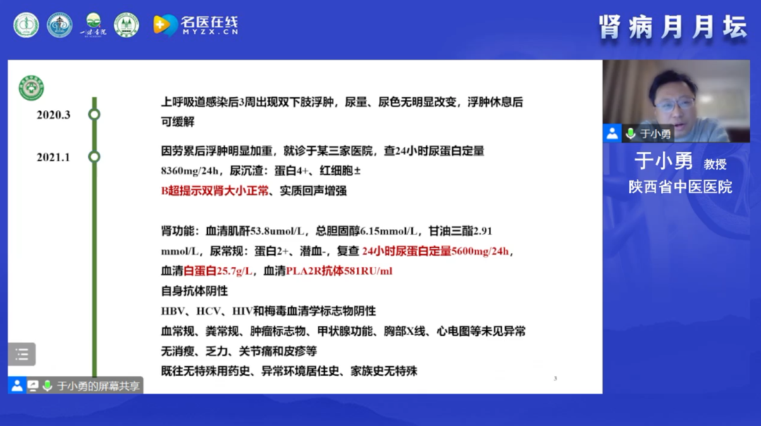 于小勇教授在線分享了一例特殊的抗PLA2R抗體介導(dǎo)的膜性腎病。于教授詳細(xì)介紹了患者的診治經(jīng)過(guò)及隨訪情況,該患者是一名24歲的年輕男性,甘肅人,間斷性雙下肢浮腫2年余,因勞累后加重而入院,復(fù)查24小時(shí)尿蛋白定量 5.6g/24h、血清白蛋白 25.7g/L、血抗PLA2R抗體 581RU/mL,同時(shí)于教授也進(jìn)行了其他可能繼發(fā)性因素的排查,并以甘肅本地腫瘤發(fā)病率高低為依據(jù)進(jìn)行了腫瘤的排查,上述結(jié)果均未見(jiàn)異常。初步診斷為腎病綜合征、PLA2R抗體介導(dǎo)的膜性腎病,在追加病理檢測(cè)后,修訂診斷為原發(fā)性腎病綜合征、PLA2R抗體介導(dǎo)的膜性腎?。↖I-III期)。隨后,以指南建議為依據(jù)進(jìn)行了規(guī)范治療,血清學(xué)標(biāo)志物變化出現(xiàn)非常罕見(jiàn)現(xiàn)象:Scr、ALB和24h尿蛋白都在轉(zhuǎn)好,而抗PLA2R抗體的水平在經(jīng)歷前期一次下降后,轉(zhuǎn)而開(kāi)始攀升未再下降,最后一次檢測(cè)結(jié)果24h尿蛋白為0.15g/24h、抗PLA2R抗體為221.1RU/mL,隨訪時(shí)患者自我感覺(jué)良好。于教授拋出以下幾點(diǎn)思考:MN是否均應(yīng)該依據(jù)高抗體滴度啟動(dòng)免疫治療?某些情況下是否動(dòng)態(tài)監(jiān)測(cè),讓子彈再飛一會(huì)?患者臨床緩解,免疫學(xué)尚未緩解的原因是什么?隨后,于教授帶著問(wèn)題進(jìn)行了精彩的文獻(xiàn)復(fù)習(xí)與回顧,為問(wèn)題真相的揭示給出了更多的探索方向。