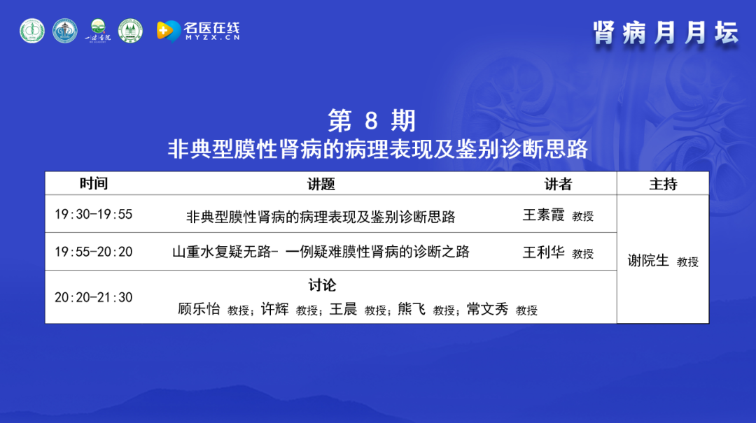 眾所周知,腎臟病患病率很高,特別是膜性腎病,在很多單位的腎活檢比率中占據(jù)第一;膜性腎病的無創(chuàng)診斷和治療手段日新月異;而且膜性腎病的異質(zhì)性很大,很多膜性腎病的病理表現(xiàn)幾乎一致,但是致病原因卻不一致,診療手段應對應病因。基于此背景,“腎病月月壇”自今年5月17日以來開始舉辦,在每個月的第三周的周二晚上,每月一期,每期一個主題,已經(jīng)舉辦了七期,包括“激素和免疫抑制劑在膜性腎病的合理應用”、“利妥昔單抗在膜性腎病的合理應用”、“原發(fā)性和繼發(fā)性膜性腎病的鑒別”及“中醫(yī)對膜性腎病的認識”、“膜性腎病的抗原分類及發(fā)病機制”、“膜性腎病的臨床表現(xiàn)、無創(chuàng)診斷和病理診斷”以及“膜性腎病的自發(fā)緩解和非免疫抑制治療”。今天是第8期,本期論壇的主題是“非典型膜性腎病的病理表現(xiàn)及鑒別診斷思路”。邀請的講者和點評、討論嘉賓都是業(yè)內(nèi)非常著名的臨床專家、研究生導師、腎內(nèi)科主任,具有豐富的臨床、教學和科研經(jīng)驗,相信他們的分享一定會對大家的臨床診療有所幫助。