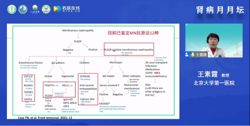 王素霞教授在線分享了非典型膜性腎病診斷和鑒別診斷的思路。首先介紹了膜性腎病的基本病理特征,以及近十年來膜性腎病致病性抗原的研究有了飛速的進展,尤其在2009年Beck團隊發(fā)現(xiàn)了原發(fā)性MN的抗原PLA2R及血清抗體IgG4。使得對MN的認識有了飛躍的進展。王教授指出對于非典型膜性腎病的診斷,首先應當根據(jù)其病理表現(xiàn)進行初步的判斷。繼發(fā)性MN常表現(xiàn)為不典型MN,光鏡檢查、免疫熒光、IgG亞型-輕鏈、抗原檢測和電鏡檢查等有助于典型與非典型MN的鑒別診斷。多種病因可導致繼發(fā)性膜性腎病,青年人應排除外感染、自身免疫病、藥物、毒物(汞)等相關MN;老年人注意排除外腫瘤相關MN。腫瘤相關MN的抗原種類包括NELL-1,IgG亞型以IgG1為主,第二位與腫瘤相關的MN抗原為THSD7A,也有相關文獻表明極少數(shù)腫瘤相關MN也可表達PLA2R。王教授還指出不同致病性抗原的檢測有助于繼發(fā)性MN的病因?qū)W診斷,MN為一類病理形態(tài)相似的損傷模式,推薦基于抗原與繼發(fā)性疾病相結(jié)合的MN新分類,將為臨床治療與發(fā)病機制探討提供重要依據(jù)。