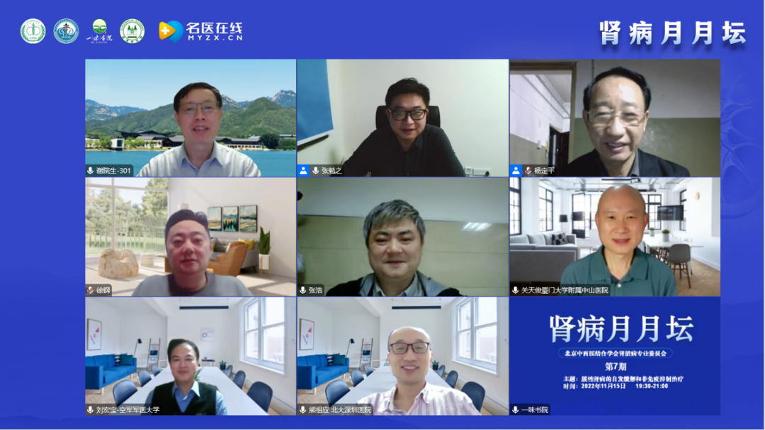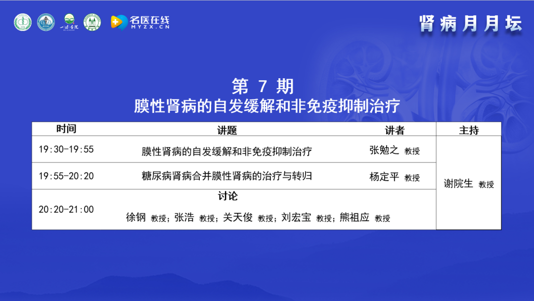 疫情可能影響大家相聚,但卻阻止不了學(xué)術(shù)交流,“腎病月月壇”第七期如期而至。謝教授代表北京中西醫(yī)結(jié)合學(xué)會腎臟病專業(yè)委員會對各位專家、各位同仁及各位朋友出席本期“腎病月月壇”表示熱烈的歡迎和衷心的感謝。謝教授介紹,“腎病月月壇”簡單五個字卻蘊含著三層寓意:首先,“腎病”是指咱們論壇聚焦腎病和腎臟相關(guān)疾病的診斷、治療和預(yù)防,臨床、科研和教學(xué)。因為現(xiàn)在腎臟病很常見,腎臟病的診療手段日升月異。比如膜性腎病,血中抗體的無創(chuàng)診斷,單克隆抗體的合理使用等,不學(xué)習(xí)就會落伍。其次,是“月月”,本論壇每個月舉辦一次,時間固定在每個月第三周的星期二晚上19:30-21:30,以便于參會者能夠提前安排好時間準(zhǔn)時參加線上直播,同時,為了滿足時間確實沖突無法參加線上直播又迫切想學(xué)習(xí)的同行而提供了回放功能;最后是“壇”,“壇”也有三層意思,一是學(xué)術(shù)論壇,在這里只要是學(xué)術(shù)相關(guān)的內(nèi)容,什么都可以說。二是談話、交談,大家可以在這里平等地交談。三是平臺,學(xué)術(shù)交流的平臺、思想交流的平臺,情感交流的平臺,我們很多老朋友很久沒有見面了,通過腎病月月壇,可以每個月在云端見面一次。謝教授介紹道,“腎病月月壇”自今年5月17日開壇以來,每期一個主題,已經(jīng)舉辦了六期,包括“激素和免疫抑制劑在膜性腎病的合理應(yīng)用”、“利妥昔單抗在膜性腎病的合理應(yīng)用”、“原發(fā)性和繼發(fā)性膜性腎病的鑒別”及“中醫(yī)對膜性腎病的認(rèn)識”、“膜性腎病的抗原分類及發(fā)病機制”以及“膜性腎病的臨床表現(xiàn)、無創(chuàng)診斷和病理診斷”。本期論壇的主題是“膜性腎病的自發(fā)緩解和非免疫抑制治療”。邀請的講者和點評、討論嘉賓都是業(yè)內(nèi)非常著名的臨床專家、研究生導(dǎo)師、業(yè)務(wù)院長、大內(nèi)科主任、腎內(nèi)科主任,具有豐富的臨床、教學(xué)和科研經(jīng)驗,相信他們的分享一定會對大家的臨床診療有所幫助。