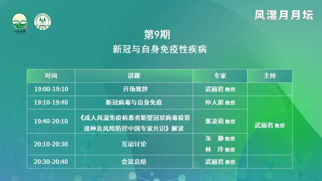 2023年4月17日(周一),由一味書(shū)院主辦的《風(fēng)濕月月壇(第9期)—新冠與自身免疫性疾病》于線上成功舉行。本次論壇由新疆維吾爾自治區(qū)人民醫(yī)院武麗君教授擔(dān)任大會(huì)主席,原上海長(zhǎng)征醫(yī)院仲人前教授、華中科技大學(xué)同濟(jì)醫(yī)學(xué)院附屬同濟(jì)醫(yī)院董凌莉教授作為講課嘉賓,四川省人民醫(yī)院朱靜教授、汕頭大學(xué)醫(yī)學(xué)院第一附屬醫(yī)院林玲教授作為本次大會(huì)的討論嘉賓。