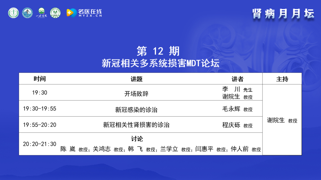 2023年4月11日,由北京中西醫(yī)結(jié)合學(xué)會(huì)腎臟病專業(yè)委員會(huì)舉辦的《腎病月月壇(第12期)——新冠相關(guān)多系統(tǒng)損害MDT論壇》于線上成功舉辦。本次論壇由北京中西醫(yī)結(jié)合學(xué)會(huì)腎臟病專業(yè)委員會(huì)主任委員、解放軍總醫(yī)院第一醫(yī)學(xué)中心謝院生教授擔(dān)任大會(huì)主席,歐蒙醫(yī)學(xué)診斷CEO,一味書院執(zhí)行院長(zhǎng)、發(fā)起人李川先生作為致辭嘉賓,北京醫(yī)院毛永輝教授、解放軍總醫(yī)院第二醫(yī)學(xué)中心程慶礫教授作為講課嘉賓,中山大學(xué)附屬第一醫(yī)院陳崴教授、北京協(xié)和醫(yī)院關(guān)鴻志教授、浙江大學(xué)醫(yī)學(xué)院第一附屬醫(yī)院韓飛教授、北京大學(xué)航天臨床醫(yī)學(xué)院蘭學(xué)立教授、首都醫(yī)科大學(xué)附屬北京佑安醫(yī)院閆惠平教授以及上海長(zhǎng)征醫(yī)院仲人前教授作為本次大會(huì)的討論嘉賓。