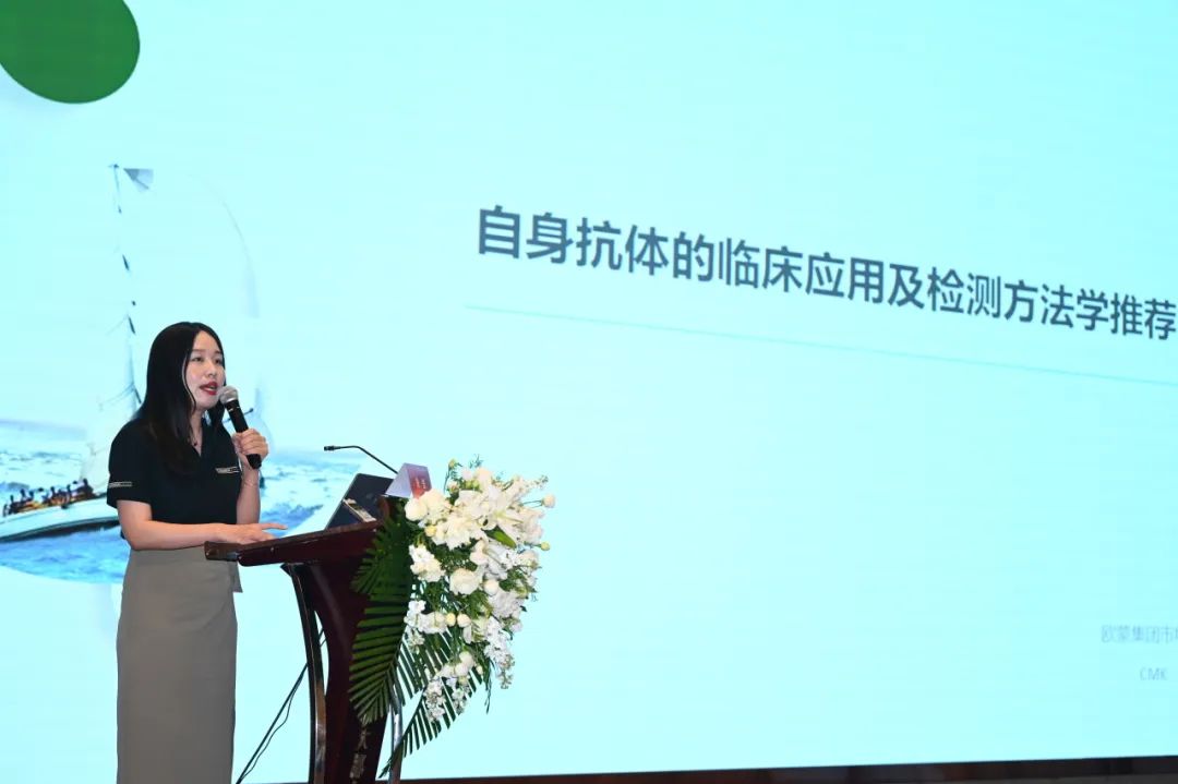 朱女士進(jìn)行了題為“自身抗體的臨床應(yīng)用及檢測方法學(xué)推薦”的學(xué)術(shù)報(bào)告,作為本次會議的承辦單位,她首先代表歐蒙公司對各位遠(yuǎn)道而來的老師表示了感謝。她指出,自身抗體在自身免疫性疾病診療過程中的很多環(huán)節(jié)都具有重要的應(yīng)用價(jià)值,如預(yù)測、診斷、鑒別診斷、治療監(jiān)測和預(yù)后評估等。截至目前用于自身抗體檢測的方法學(xué)非常豐富,除了經(jīng)典的IIF、ELISA、放射免疫法及免疫印跡法之外,還有被逐步應(yīng)用于自身免疫性疾病領(lǐng)域的化學(xué)發(fā)光法。作為ANA檢測的金標(biāo)準(zhǔn),IIF通常被用作進(jìn)行總抗體的篩查,它憑借著自己的諸多優(yōu)勢,在自身抗體檢測方面始終無可替代。免疫印跡法,在特異性抗體確認(rèn)方面,一直以來應(yīng)用率都是最高的,占了80%左右,且經(jīng)過了長年的臨床驗(yàn)證,其檢測性能也是非常穩(wěn)定的?;瘜W(xué)發(fā)光法,在自身抗體檢測領(lǐng)域應(yīng)用率越來越高,近兩年NCCL室間質(zhì)評數(shù)據(jù)顯示,在ANA特異性抗體確認(rèn)方面有10%以上的實(shí)驗(yàn)室都已開展了化學(xué)發(fā)光法。