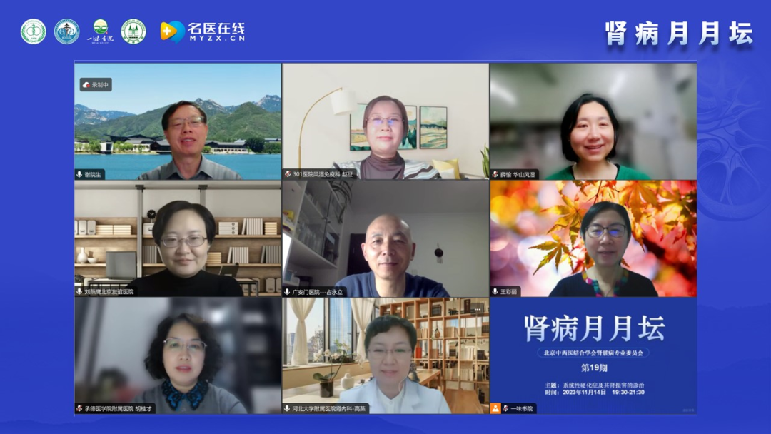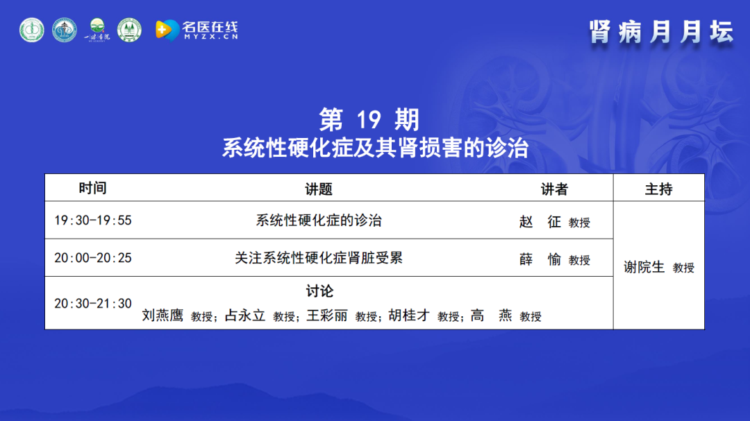 謝教授介紹腎病月月壇自2022年5月線上舉辦后受到全國(guó)同仁的支持和歡迎。學(xué)術(shù)活動(dòng)開始主要聚焦于膜性腎病,后逐漸擴(kuò)展到新冠相關(guān)性多學(xué)科論壇及風(fēng)濕病相關(guān)腎損害。在論壇內(nèi)容上,以臨床需求和臨床問題為導(dǎo)向,體現(xiàn)中醫(yī)和西醫(yī)的結(jié)合、腎科和其他學(xué)科的結(jié)合;在形式上,體現(xiàn)以講座、病例分享和點(diǎn)評(píng)討論相結(jié)合。本期討論和學(xué)術(shù)交流的主要內(nèi)容是系統(tǒng)性硬化癥及其腎損害的診治,邀請(qǐng)的講者和討論嘉賓都是風(fēng)濕科和腎內(nèi)科在系統(tǒng)性硬化癥領(lǐng)域很有經(jīng)驗(yàn)的專家,相信能為大家?guī)?lái)有價(jià)值的內(nèi)容。