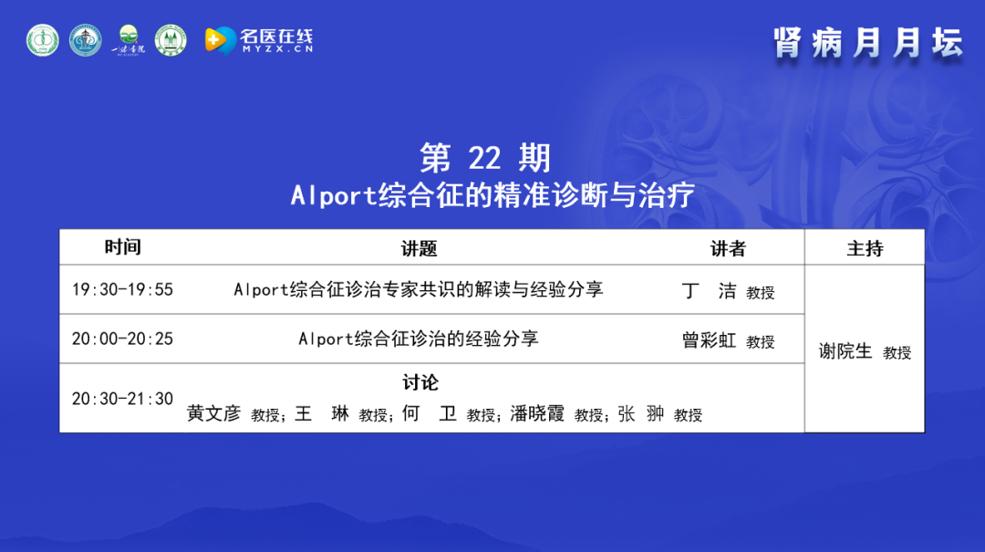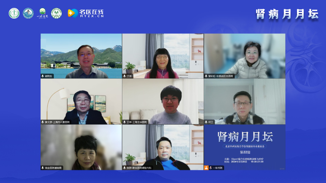 謝教授簡單介紹了“腎病月月壇”的歷史,“腎病月月壇”是在2022年5月疫情防控期間開始的線上學(xué)術(shù)交流活動(dòng),每個(gè)月第3周的周二晚上19:30-21:30開展,其形式是講座與討論相結(jié)合;論壇內(nèi)容以臨床問題和臨床需求為導(dǎo)向,通過中醫(yī)和西醫(yī)的結(jié)合、腎科和其他學(xué)科的結(jié)合,以期提升腎臟病相關(guān)領(lǐng)域的診療水平。本期討論和交流的主要內(nèi)容是Alport綜合征的精準(zhǔn)診斷與治療,邀請(qǐng)的講者和討論嘉賓都是在該領(lǐng)域有很深造詣的專家,相信能為大家?guī)碛袃r(jià)值的內(nèi)容。