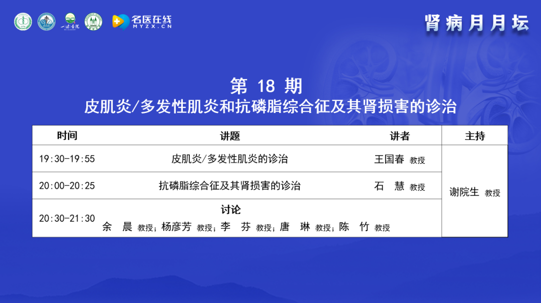 謝教授介紹腎病月月壇自2022年5月線上舉辦后受到全國同仁的支持和歡迎。學(xué)術(shù)活動(dòng)開始主要聚焦于腎臟疾病,以膜性腎病為主,后逐漸擴(kuò)展到新冠相關(guān)性多學(xué)科論壇及風(fēng)濕病相關(guān)腎損害。在論壇內(nèi)容上,以臨床需求和臨床問題為導(dǎo)向,體現(xiàn)中醫(yī)和西醫(yī)的結(jié)合、腎科和其他學(xué)科的結(jié)合;在形式上,體現(xiàn)以講座、病例分享和點(diǎn)評(píng)討論相結(jié)合。本期討論和學(xué)術(shù)交流的主要內(nèi)容是皮肌炎、多發(fā)性肌炎和抗磷脂綜合征及其腎損害。皮肌炎、多發(fā)性肌炎和抗磷脂綜合征腎損害在臨床上常見,影響著患者的生活質(zhì)量和生命質(zhì)量。論壇內(nèi)容同樣包括講座和點(diǎn)評(píng)討論,針對(duì)皮肌炎、多發(fā)性肌炎和抗磷脂綜合征及其腎損害的問題展開交流和討論。本期邀請(qǐng)的講者和點(diǎn)評(píng)、討論嘉賓都是風(fēng)濕科和腎內(nèi)科非常著名的專家,具有豐富的臨床、教學(xué)和科研經(jīng)驗(yàn)。