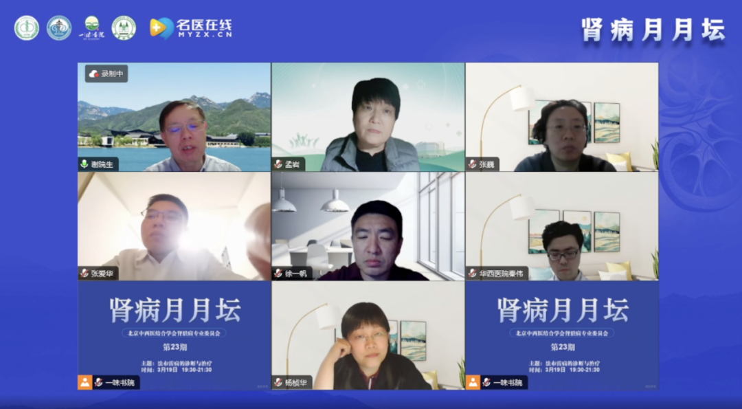 謝教授代表北京中西醫(yī)結(jié)合學(xué)會(huì)腎臟病專(zhuān)業(yè)委員會(huì)、北京中西醫(yī)結(jié)合腎臟疑難病會(huì)診中心以及一味書(shū)院對(duì)各位專(zhuān)家、各位同仁及各位朋友參加第23期“腎病月月壇”表示熱烈的歡迎和衷心的感謝,同時(shí)感謝名醫(yī)在線(xiàn)的轉(zhuǎn)播。