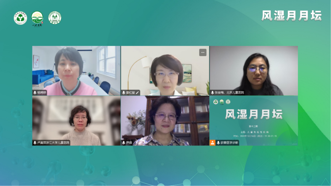 2024年10月16日(周三),由中國老年保健協(xié)會和一味書院主辦的《風濕月月壇(第13期)—兒童免疫性疾病》于線上成功舉辦。本次論壇由南中國醫(yī)科大學附屬第一醫(yī)院楊娉婷教授擔任大會主席,中國醫(yī)科大學附屬第一醫(yī)院姜紅堃教授、北京兒童醫(yī)院張俊梅教授作為講課嘉賓,浙江大學醫(yī)學院附屬兒童醫(yī)院盧美萍教授、武漢兒童醫(yī)院尹薇教授作為本次會議的討論嘉賓。