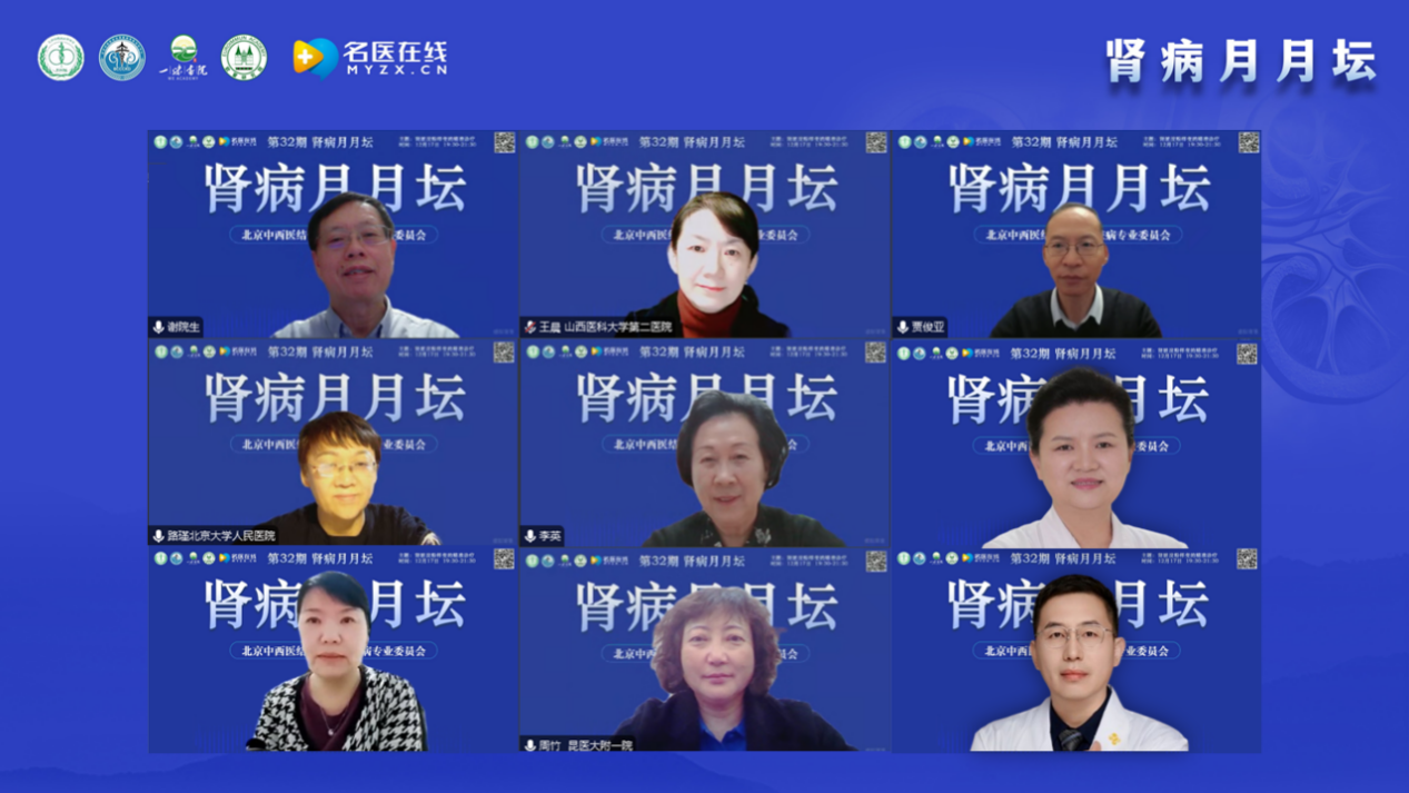謝教授簡單介紹了“腎病月月壇”的歷史,“腎病月月壇”是在2022年5月疫情防控期間開始的線上學(xué)術(shù)交流活動,每個月第3周的周二晚上19:30-21:30開展,其形式是講座與討論相結(jié)合;每期一個主題,已完成的主題包含膜性腎病及其并發(fā)癥、風(fēng)濕性疾病腎損害、遺傳性腎病的中西醫(yī)結(jié)合診治、血液病和腫瘤相關(guān)腎損害等。