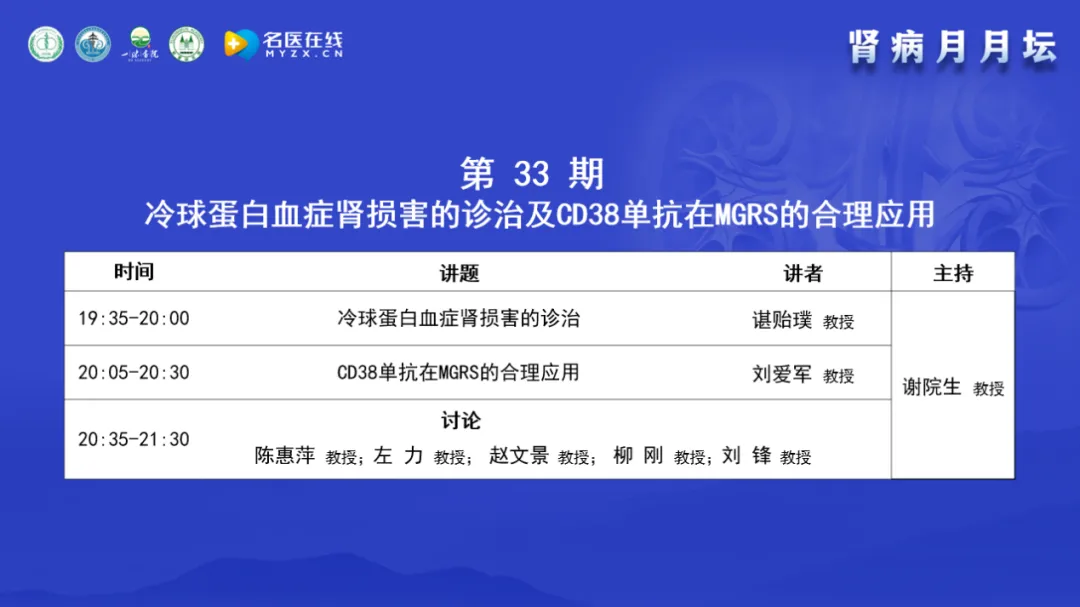今天的主題是冷球蛋白血癥腎損害的診治及CD38單抗在MGRS的合理應(yīng)用》,今天很榮幸的邀請(qǐng)到了腎臟病專家和血液病專家,臨床專家和病理專家,中醫(yī)專家和西醫(yī)專家,都是非常有經(jīng)驗(yàn)和心得的著名專家,大家一起進(jìn)行學(xué)術(shù)交流與討論。