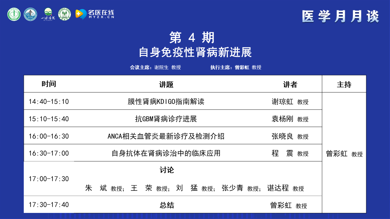 首先感謝謝院生教授精心組織醫(yī)學(xué)月月談,其次感謝四位講者為本次論壇做的精心準(zhǔn)備。本次論壇四位講者對膜性腎病、抗GBM病、ANCA相關(guān)血管炎及自身抗體在足細(xì)胞病中的應(yīng)用進(jìn)行了發(fā)病機(jī)制、診斷、治療的介紹,五位討論嘉賓對講者的內(nèi)容提出了自己的觀點(diǎn),同時也對臨床上存在的問題和講者之間進(jìn)行了討論和交流。目前醫(yī)學(xué)月月談系列活動共進(jìn)行了30多期,期盼后面的內(nèi)容更加精彩。