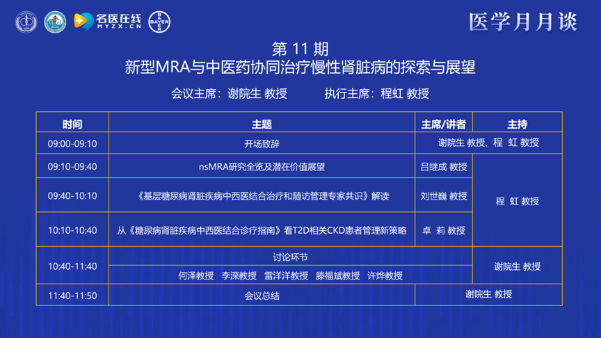 謝教授表示“醫(yī)學(xué)月月談”的前身是“腎病月月壇”,升級(jí)為醫(yī)學(xué)月月談不僅是名稱的拓展,更是學(xué)術(shù)視野的延伸。會(huì)議議題已從單一腎病領(lǐng)域,拓展至腎內(nèi)科、風(fēng)濕免疫科、神經(jīng)內(nèi)科、檢驗(yàn)科等多學(xué)科交叉融合的平臺(tái)。此外,我們始終以 “臨床需求為導(dǎo)向、解決臨床問(wèn)題為目的”。堅(jiān)持每月1~ 2 次、線上線下聯(lián)動(dòng),每期聚焦一個(gè)主題,通過(guò)“講座+點(diǎn)評(píng)討論”的形式,推動(dòng)西醫(yī)與中醫(yī)、臨床與檢驗(yàn)病理、精準(zhǔn)診斷與有效治療的深度結(jié)合。本期醫(yī)學(xué)月月談的主題是新型MRA與中醫(yī)藥協(xié)同治療慢性腎臟病的探索與展望,非常榮幸能夠邀請(qǐng)到首都醫(yī)科大學(xué)附屬北京安貞醫(yī)院程虹教授擔(dān)任執(zhí)行主席,相信在程教授的帶領(lǐng)下,各位同道能夠積極交流、碰撞思想,共同為解決慢性腎臟病臨床難題貢獻(xiàn)力量!