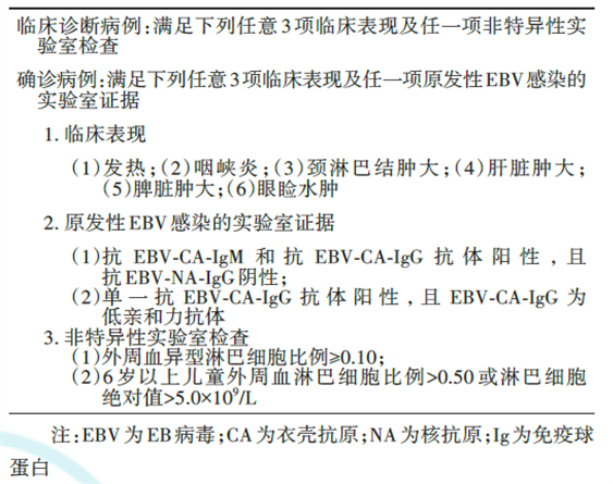 IM的診斷依據(jù)包括臨床表現(xiàn)、原發(fā)性EBV感染的實驗室證據(jù)和非特異性實驗室檢查(表1)。臨床診斷病例需滿足臨床表現(xiàn)中任意3項及非特異性實驗室檢查中任意1項,確診病例需滿足臨床表現(xiàn)中任意3項及原發(fā)性EBV感染的實驗室證據(jù)中任意1項。