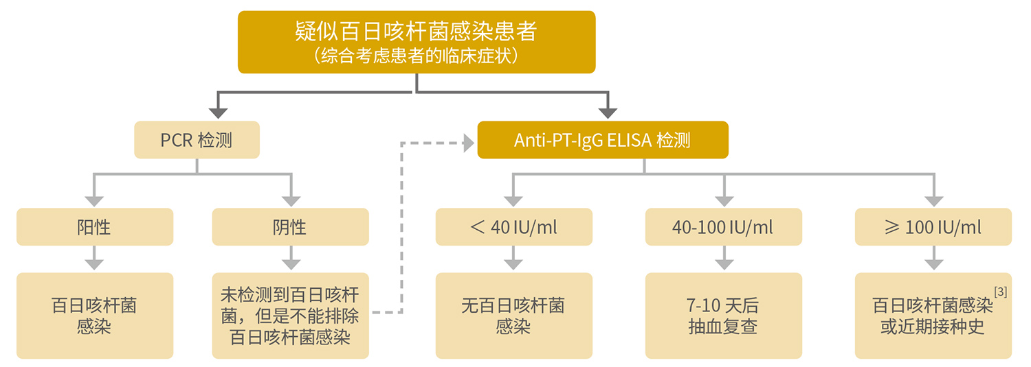 全球百日咳計(jì)劃(Global Pertussis Initiative,GPI)建議及《中國兒童百日咳診斷及治療建議》均按照不同的年齡段給出推薦的百日咳臨床診斷標(biāo)準(zhǔn)和實(shí)驗(yàn)室檢測方法。其中《中國兒童百日咳診斷及治療建議》增加了在兒童各個年齡段,均可通過發(fā)病初期與恢復(fù)期雙份血清PT-IgG滴度出現(xiàn)顯著升高(>2~4倍)進(jìn)行診斷。